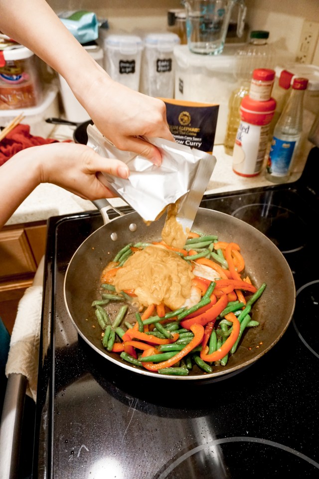 Blue Elephant yellow curry comes in one packet, and to make it you heat it up and just add water. THATโS IT. Iโm going to be honest, at first I was skeptical. How can something where you just add water possibly taste as good as the restaurant? But let me tell you guys, IT WAS ACTUALLY SO GOOD. I would not have been able to tell the difference between this curry and the one I ordered from a takeout place last weekend. I was shook. It was so fast and easy. Blue Elephant takes pride in their all natural ingredients and authenticity (made in Thailand with 100% Thai ingredients). They donโt use any preservatives, artificial coloring, or MSG. They totally delivered.