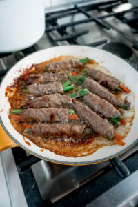 When ready to cook, heat some oil in a skillet. Place beef rolls in skillet and let pan fry for 2-3 minutes.